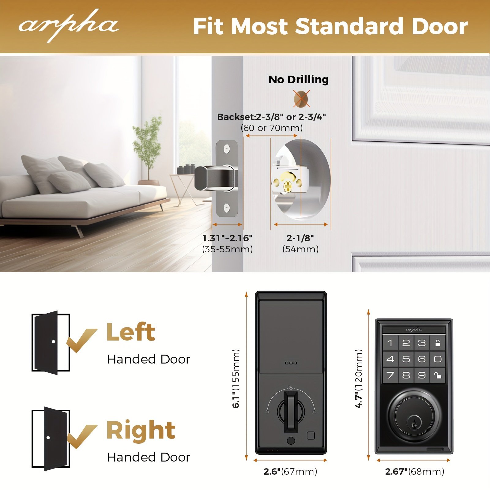 Arpha Keyless Entry Door Lock, Deadbolt Lock With Keypad And Two Keys, One-Touch Lock/Unlock, Battery Powered Not Included, Auto-Lock, Anti-peeping Password, Up To 100 User Passwords, Easy To Install